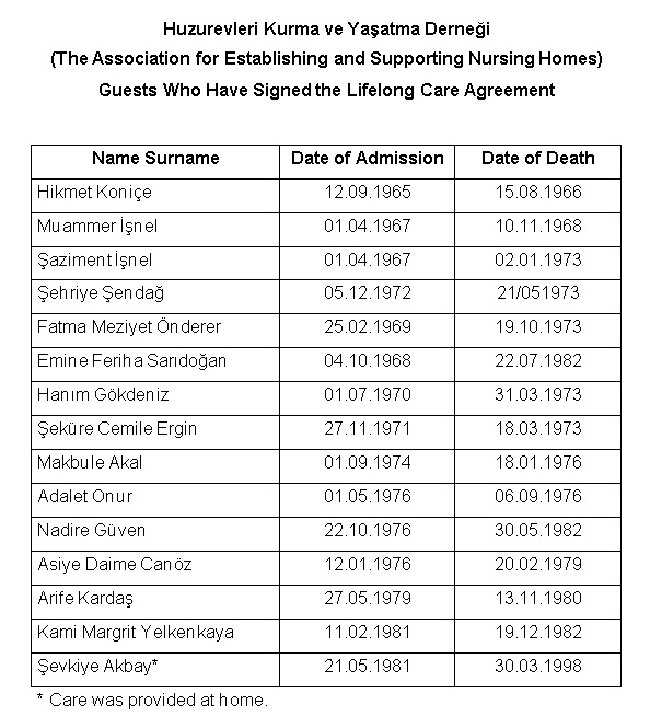 In this context, our association has signed Lifelong Care Agreements with a total of 12 individuals since its establishment, and the care and supervision of these elderly individuals has been provided by our association until the end of their lives. Of the 12 individuals, 11 resided in our nursing home, and the care of one was provided in their home.